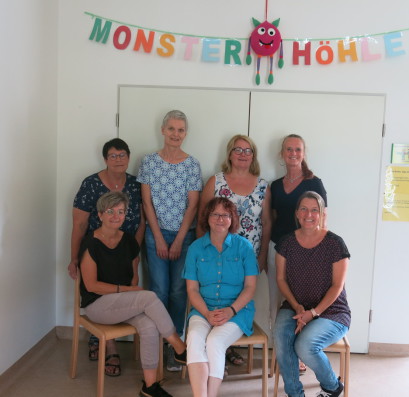 85 Kinder werden insgesamt in diesem Schuljahr in der Zeit von 12.00 - 16.00 Uhr betreut. Die Mitarbeiterinnen sind (von links nach rechts): Frau Paffhausen (unten), Frau Eckloff (oben), Frau Bremm (oben), Frau Klöckner (unten), Frau Graziola (oben), Frau Rehn-Görres (oben), Frau Job (unten).